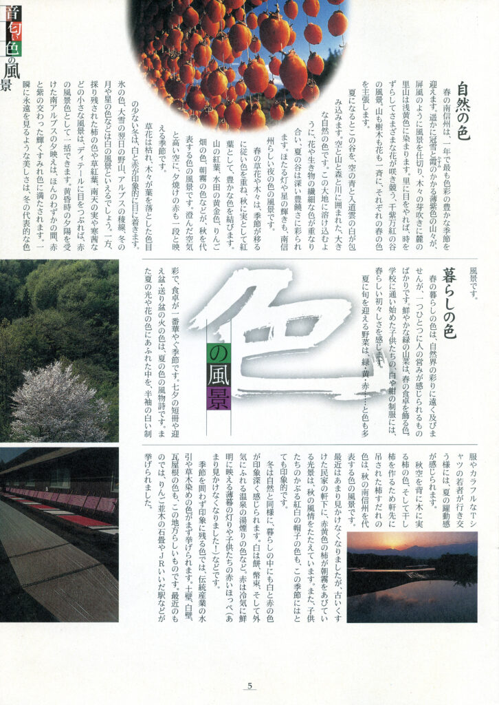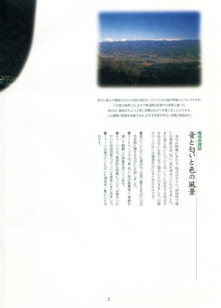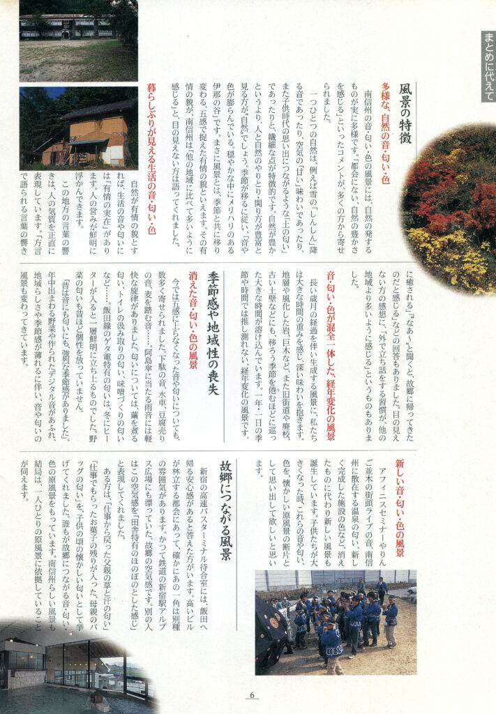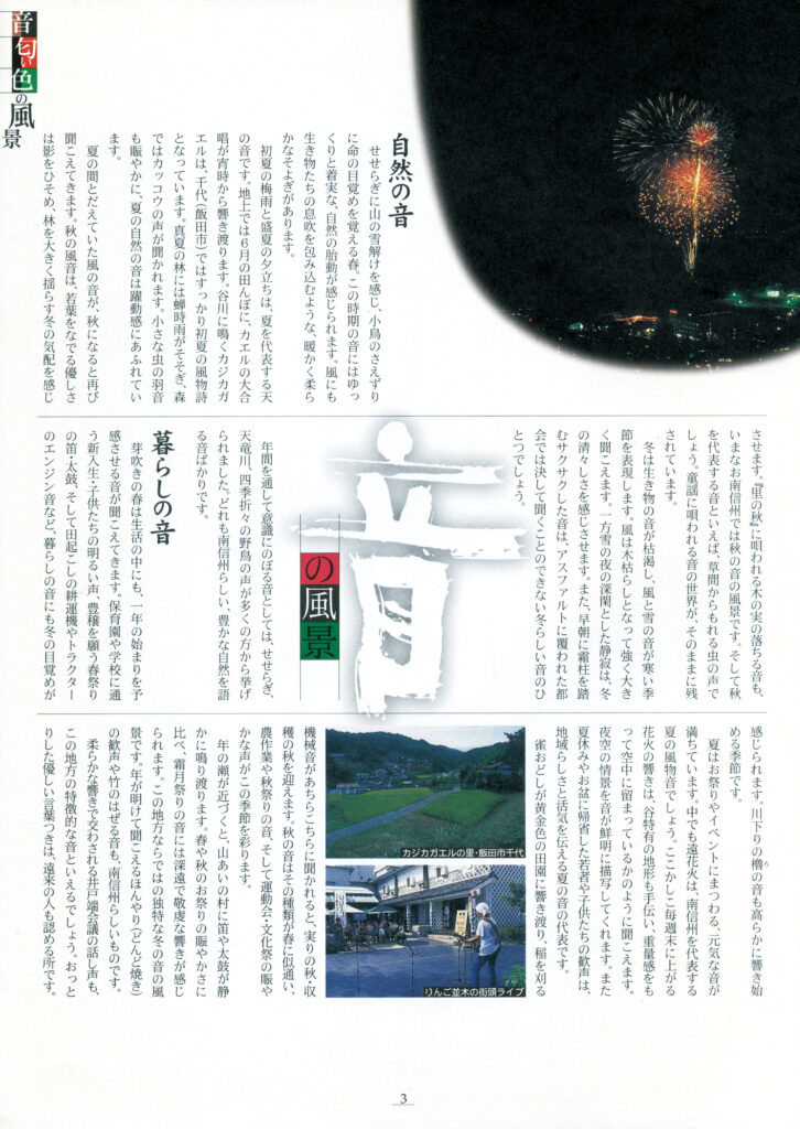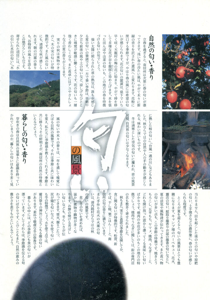 南信州広域連合が2001年10月に発行した『南信州広域だより』に、当地方らしい「音」「匂い」「色」を切り口にした風景の特集記事が載っています。