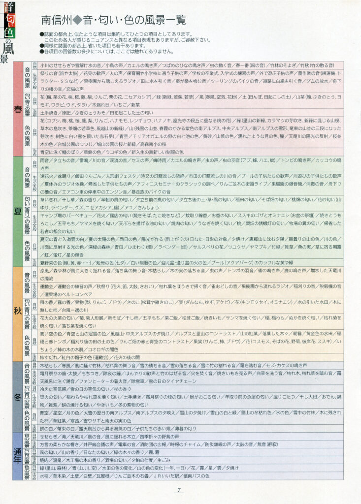 多くの方から出された南信州らしい音・匂い・色の風景を一覧にした頁です。「春」「夏」「秋」「冬」「通年」に分け、それぞれ「自然」と「生活全般」に分類しています。